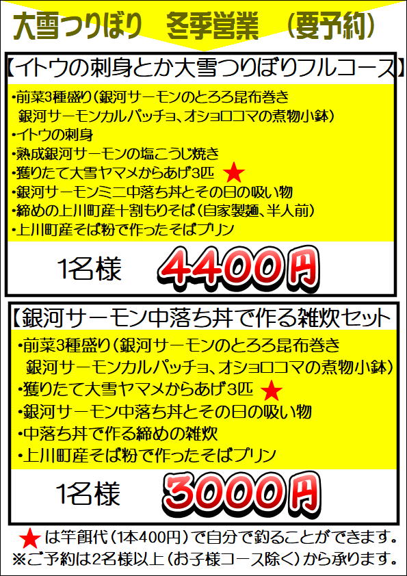 ※お持ち帰り3枚卸し(銀河サーモン)、腹出し(ヤマメ・オショロコマ)加工代は魚代に含まれて