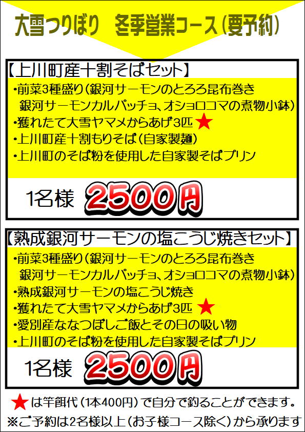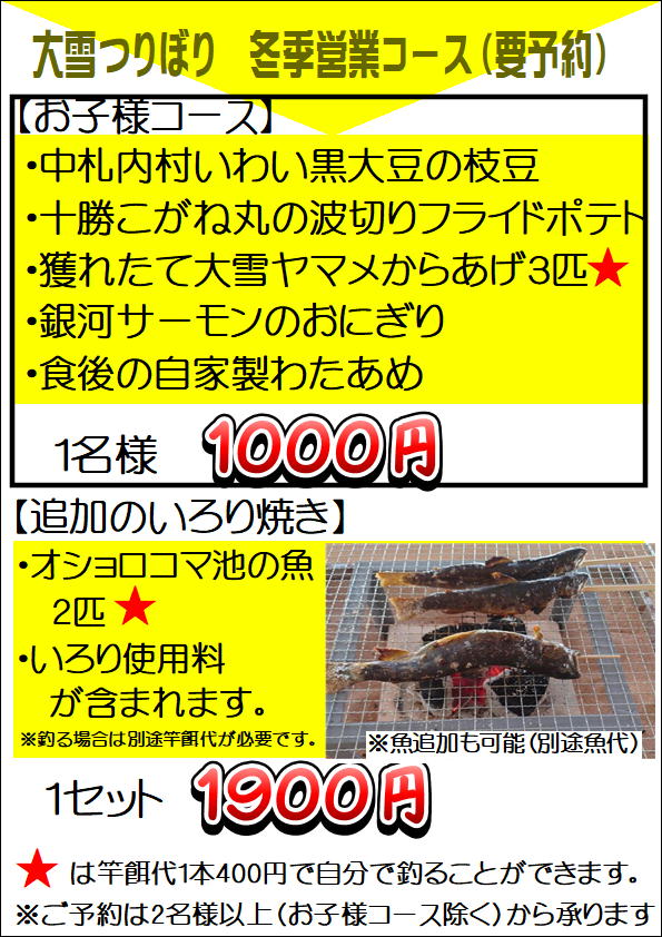 ヤマメ追加釣り・オショロコマ池の釣りも可能です(魚代別)が、銀河サーモン池は冬期間閉鎖しております。