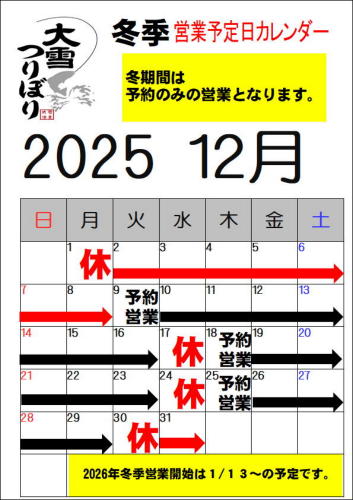 冬季営業(要予約)は12月9日(火)から開始の予定です。