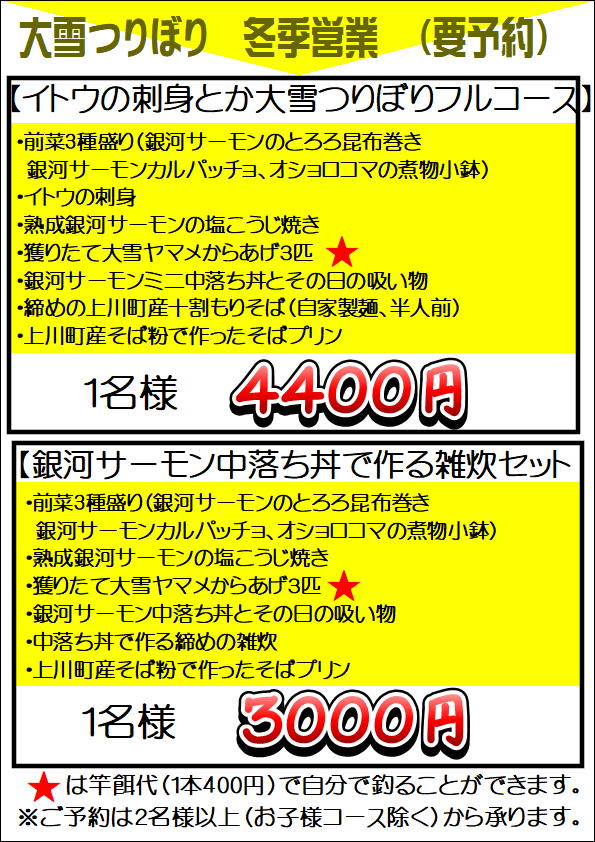 ●大雪つりぼり調理メニュー 調理してテイクアウトもできます。